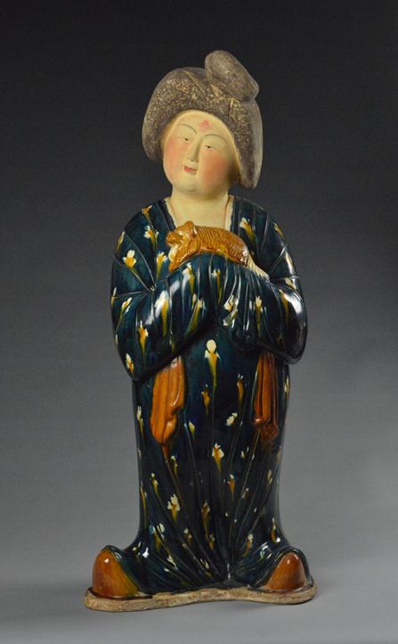 贵妇身着蓝色丝质长裙,缀黄白色花纹,脚穿黄色尖头鞋,服饰华美。人俑秀发盘顶,面部丰润,青黛描眉,巧鼻樱唇。双手拱于胸前,怀抱波斯宠物狗,体态丰腴闲雅,妩媚多姿,充分展现盛唐帝国社会稳定和谐,经济繁荣昌盛,百姓生活富足的景象。